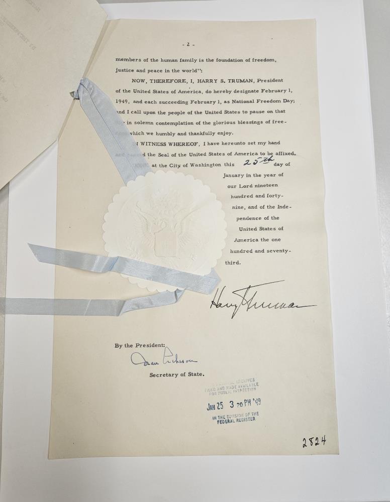 1 shkurti 1865 shënoi një moment vendimtar në historinë e Shteteve të Bashkuara, kur Presidenti Abraham Lincoln nënshkroi rezolutën e përbashkët që propozonte Amendamentin e 13-të të Kushtetutës, duke hequr zyrtarisht skllavërinë dhe duke afirmuar angazhimin e kombit ndaj lirisë dhe dinjitetit njerëzor.