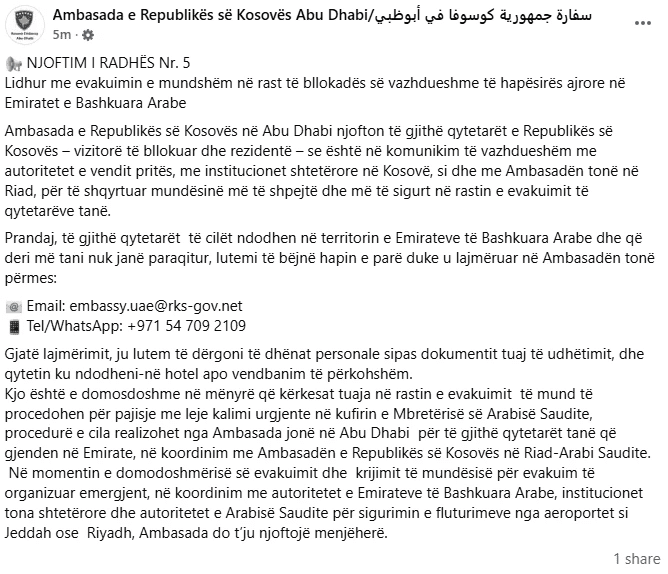 “Ambasada e Republikës së Kosovës në Abu Dhabi njofton të gjithë qytetarët e Republikës së Kosovës – vizitorë të bllokuar dhe rezidentë – se është në komunikim të vazhdueshëm me autoritetet e vendit pritës, me institucionet shtetërore në Kosovë, si dhe me Ambasadën tonë në Riad, për të shqyrtuar mundësinë më të shpejtë dhe më të sigurt në rastin e evakuimit të qytetarëve tanë”, thuhet në njoftim.
