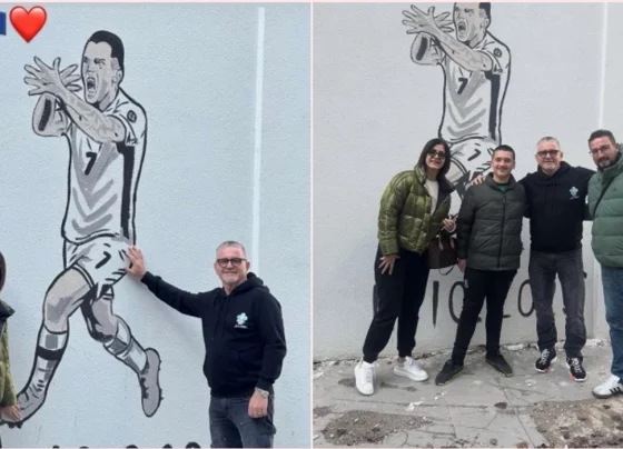Prindërit e Rey Manajt vizitojnë muralin e djalit të tyre në Mitrovicë, i cili u krijua pas golit historik ndaj Serbisë