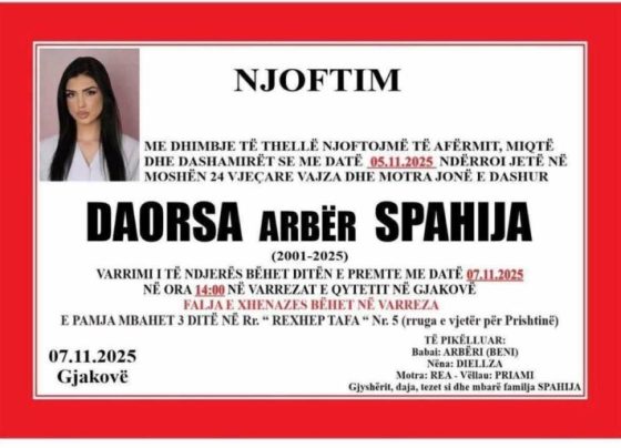 Të premten e 7 nëntorit varroset Daorsa Spahija, 24-vjeçarja nga Gjakova që vdiq mbrëmë në Tetovë të Maqedonisë së Veriut.…