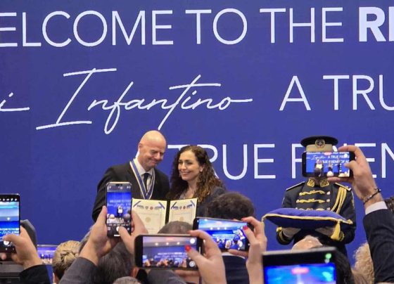 Presidenti i FIFA-s, Gianni Infantino është dekorurar nga presidentja e vendit, Vjosa Osmani. Ceremonia zyrtare po mbahet në një hotel…