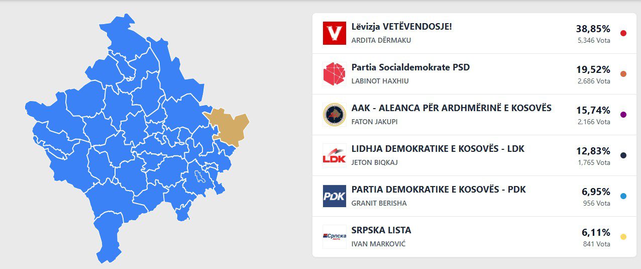 Lëvizja Vetëvendosje prin me 5 mijë e 346 vota, duke u pasur nga Partia Socialdemokrate me 2 mijë e 686 vota, e treta është Aleanca për Ardhmërinë e Kosovës me 2 mijë e 166 vota.