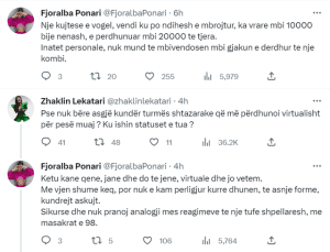 Fjoralba nuk e la me kaq duke iu kthyer sërish: “Këtu kanë qenë, janë dhe do jenë. Virtuale dhe jo vetëm. Më vjen shumë keq, por nuk e kam përligjur kurrë dhunën, të asnjë forme, kundër askujt. Sikurse nuk pranoj analogji mes reagimeve të një tufe shpellarësh me masakrat e ’98.”