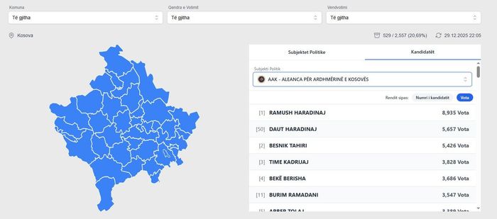 Pas numërimit të mbi 20% të votave, kandidatët e Aleancës për Ardhmërinë e Kosovës (AAK) po renditen kështu: