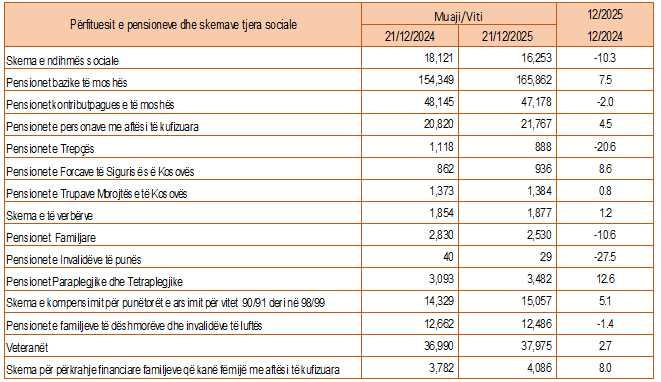 “Në muajin dhjetor 2025, krahasuar me muajin dhjetor 2024, kishte rënie të numrit të përfituesve nga: skema për pensionet invalidore (-27,5 %); skema për pensionet e Trepçës (-20,6 %); skema për pensionet familjare (-10,6 %); skema e ndihmës sociale (-10,3 %); skema e pensioneve kontribut-paguesve të moshës (-2,0 %); skema për familjet e dëshmorëve dhe invalidët e luftës (-1,4 %)”, deklaroi ASK.