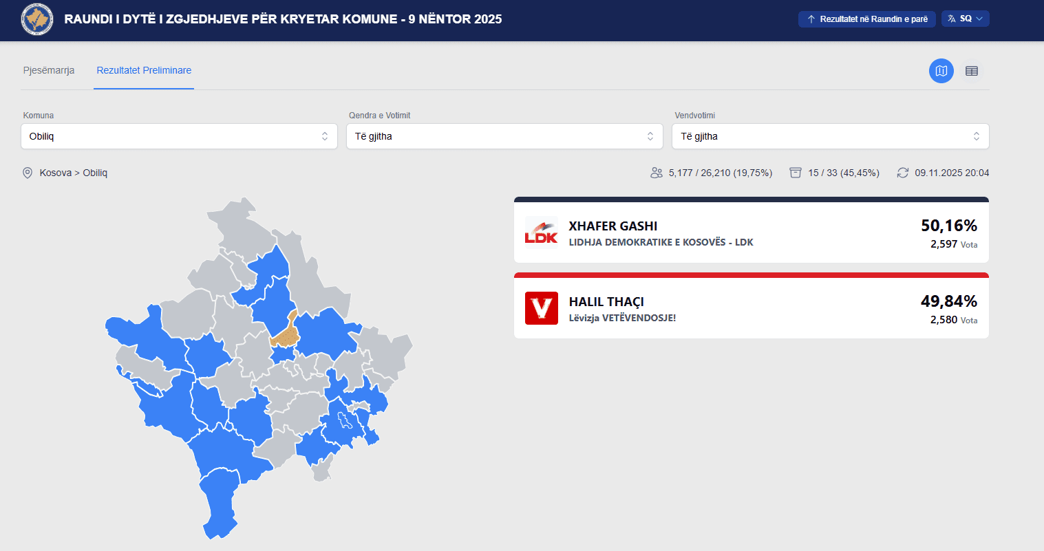 Atje, Xhafer Tahiri i LDK-së po prin me 50.16 përqind, ndërkohë që Halil Thaçi i LVV-së me 49,84 përqind.