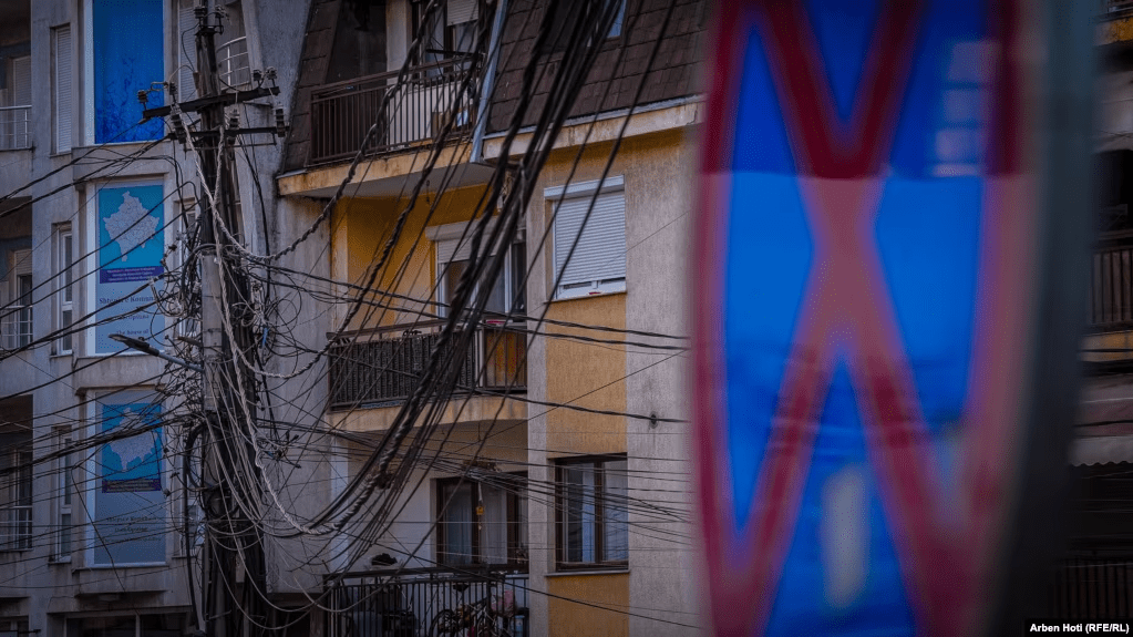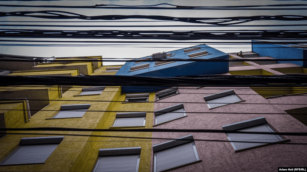 Kabllo të shumta ajrore të vendosura në mënyrë kaotike pranë ndërtesave të banimit në lagjen “Dodona” në Prishtinë.