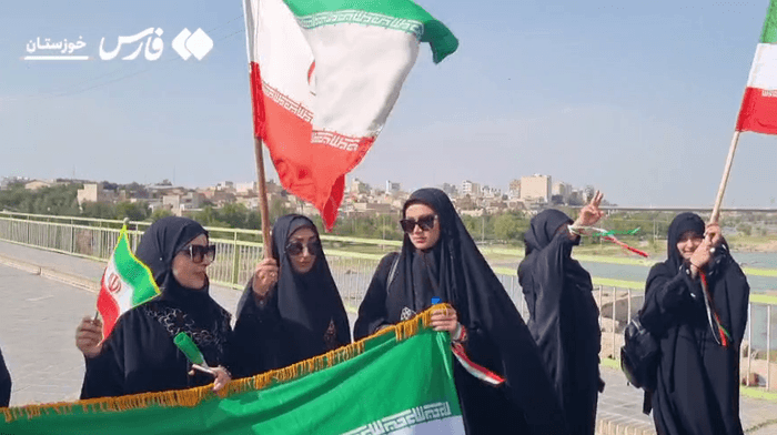 Një video e ndarë nga agjencia e lajmeve Fars tregoi njerëz që mbanin një flamur të madh iranian përgjatë urës ikonike Pol Sefid, një urë me hark në Ahwaz, Iranin jugperëndimor.
