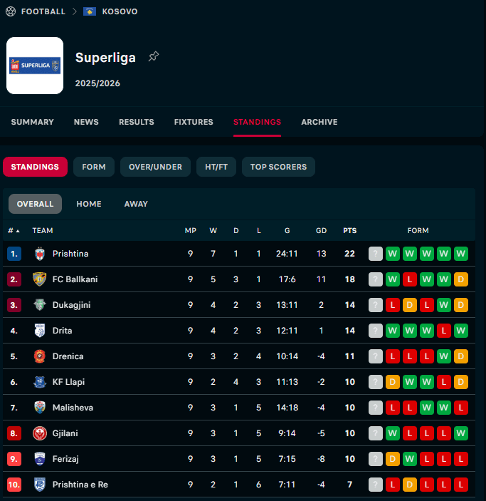 Pas këtyre përballjeve, Prishtina vazhdon të jetë lider në tabelë me 22 pikë, e ndjekur nga Ballkani me 18.
