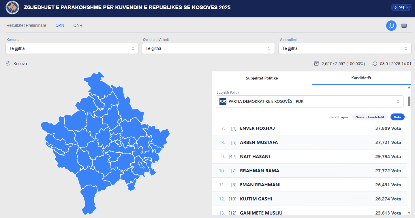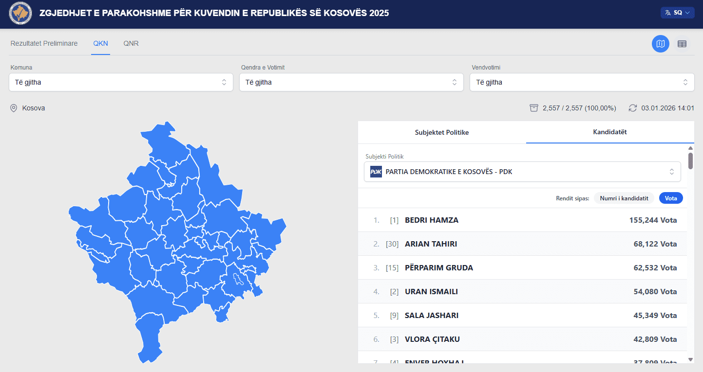 Nga lista e PDK-së, prin Bedri Hamza me 155,244 vota.