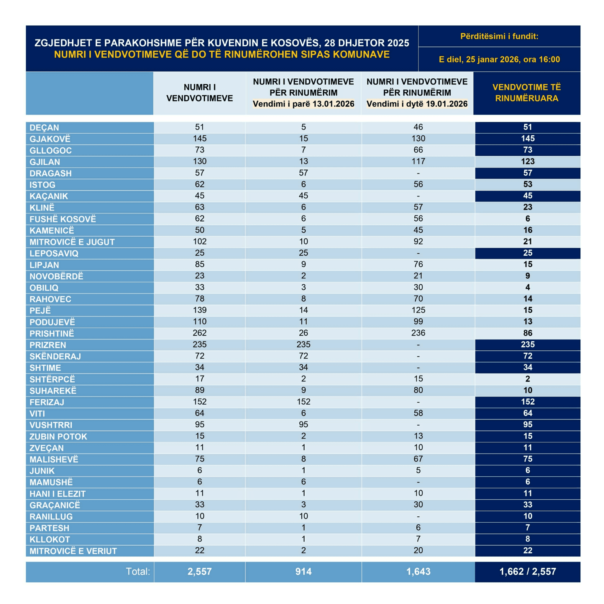Sipas zëdhënësit të KQZ-së, Valmir Elezi, nga fillimi i procesit më 13 janar 2026 dhe deri më 25 janar, janë rinumëruar 1,662 vendvotime nga gjithsej 2,557, duke përbërë 65% të totalit.