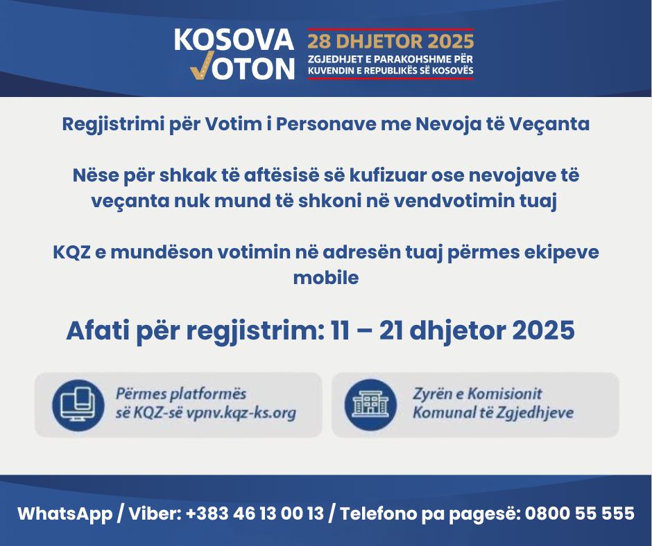 “Nëse për shkak të aftësisë së kufizuar ose nevojave të veçanta nuk mund të votoni në vendvotimin tuaj, KQZ-ja mundëson votimin në adresën tuaj përmes ekipeve mobile”, thuhet në këtë njoftim.