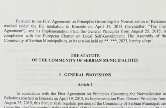 Draft-statuti i Asociacionit të komunave me shumicë serbe, i prezantuar më 2 maj në Bruksel, ka 67 nene dhe është
