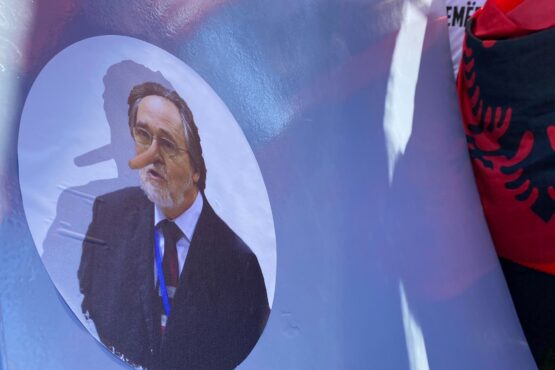 “Pinokio” i Speciales – Protestuesit në Hagë mbajnë në duar pankartën e Dick Marty-t, e quajnë gënjeshtar