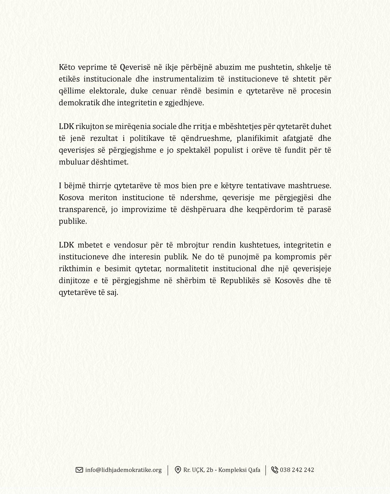 “LDK mbetet e vendosur për të mbrojtur rendin kushtetues, integritetin e institucioneve dhe interesin publik. Ne do të punojmë pa kompromis për rikthimin e besimit qytetar, normalitetit institucional dhe një qeverisjeje dinjitoze e të përgjegjshme në shërbim të Republikës së Kosovës dhe të qytetarëve të saj”.