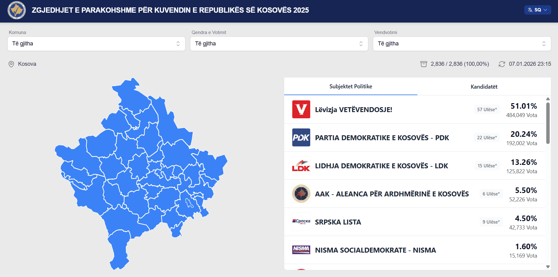 Nga të dhënat e publikuara në platformën e KQZ-së, bëhet e ditur se LVV-ja është e para me 72.62%, ndërsa pas saj është LDK me 10.27%, PDK me mbi 9.14%, dhe AAK me 3.93%.