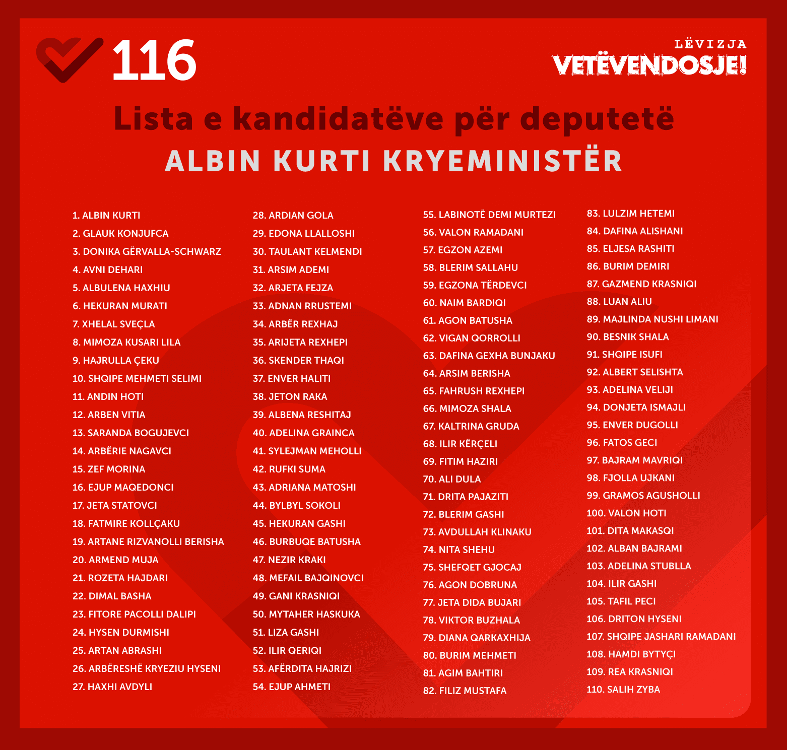 Lëvizja Vetëvendosje, top 10shen e ka të njëjtë nga hera e kaluar, ndërsa numër 11 e ka kandidat Andin Hotin, i cili mëherët ishte deputet nga radhët e PDK-së.