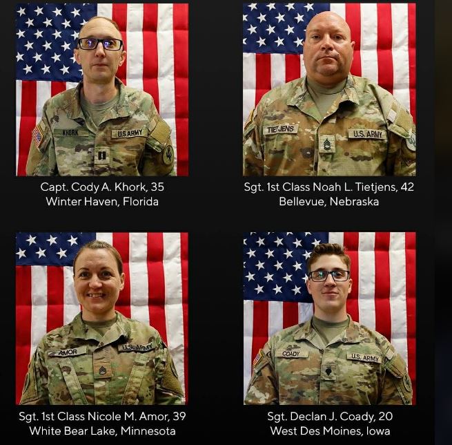 Kapiten Cody A. Khork, Rreshter i Klasit të Parë Noah L. Tietjens, Rreshter i Klasit të Parë Nicole M. Amor dhe Rreshter Declan J. Coady u vranë gjatë luftës së vazhdueshme kundër Iranit. Rezervë e Ushtrisë Amerikane