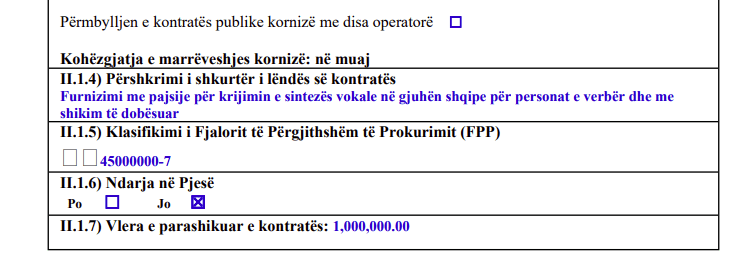 Sipas të dhënave të publikuara nga E- prokurimi, vlera e parashikuar e kontratës ishte fillimisht 1,000,000.00 euro, ndërsa e njejta ka arritur të finaliohet për 237,550.00 euro.