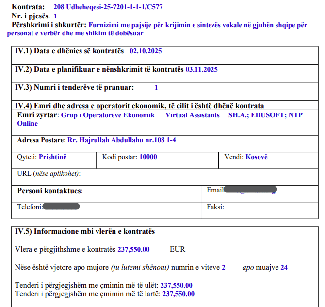 Fitues i tenderit është shpallur grupi i operatorëve wkonomik “Virtual Assistants SH.A.”, “EDUSOFT” dhe “NTP Online”, të cilët do të realizojnë furnizimin me pajisje dhe zhvillimin e teknologjisë që mundëson krijimin e sintezës vokale në gjuhën shqipe.