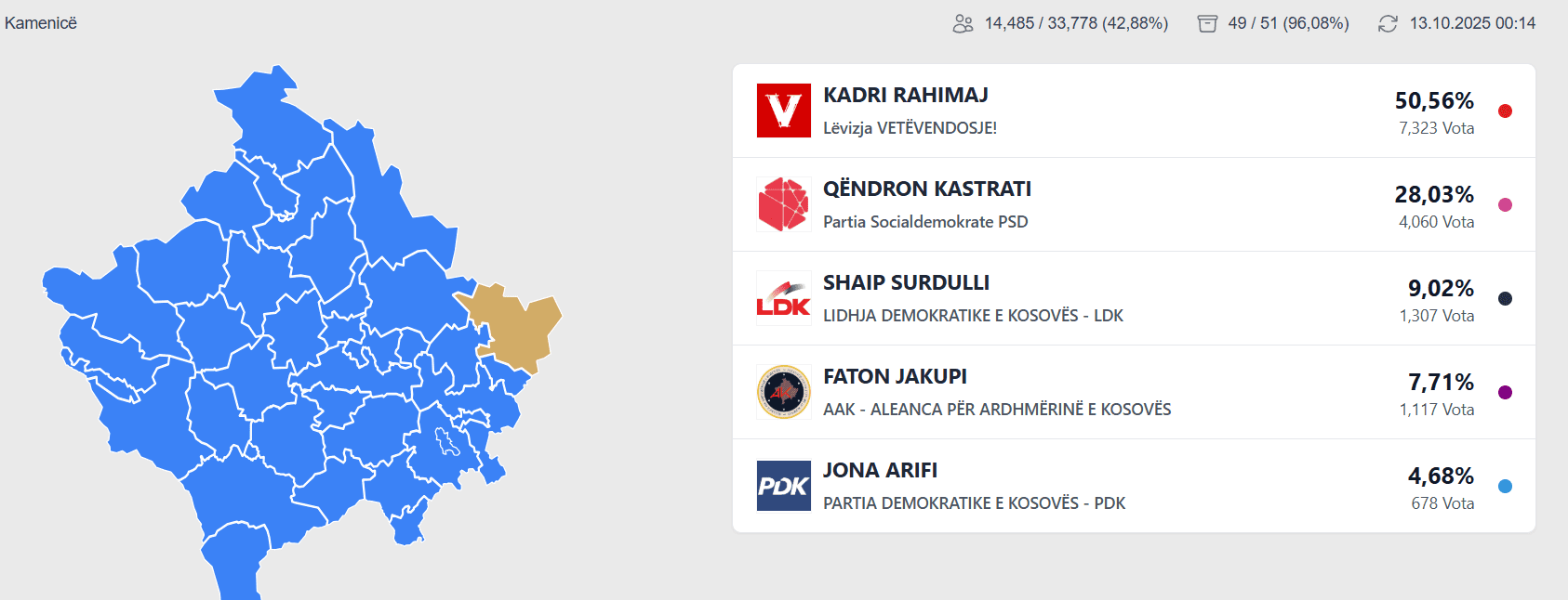 Ndonëse janë numëruar 96% të votave, Rahimaj po kryeson me 50.56%.