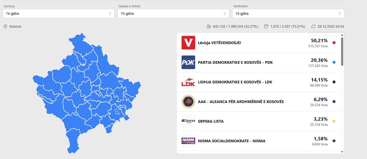 Sipas këtyre rezultateve, LVV ka 50.24 % të votave