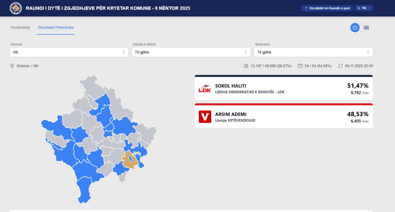 Sokol Haliti i LDK-së ka fituar 51.47 për qind të votave në Viti, sipas numërimit të 84.38 për qind.