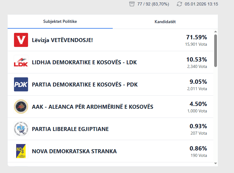 Sipas të dhënave të KQZ-së, VV ka marrë mbi 15 mijë vota, LDK dhe PDK mbi 2 mijë vota, AAK 1 mijë vota.