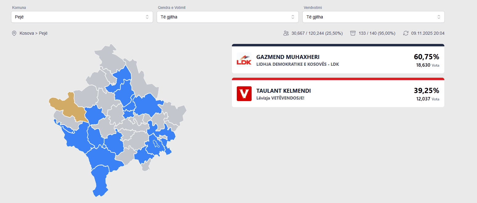 Nga 95% e votave të numëruara, Muhaxheri prin me 60.75%.