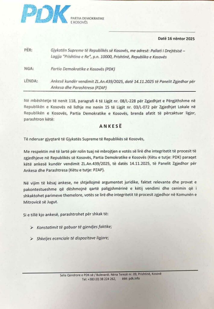 Kjo lëvizje e PDK-së vjen pasi Paneli Zgjedhor për Ankesa dhe Parashtresa ia rrëzoi të njëjtën kërkesë subjektit politik.