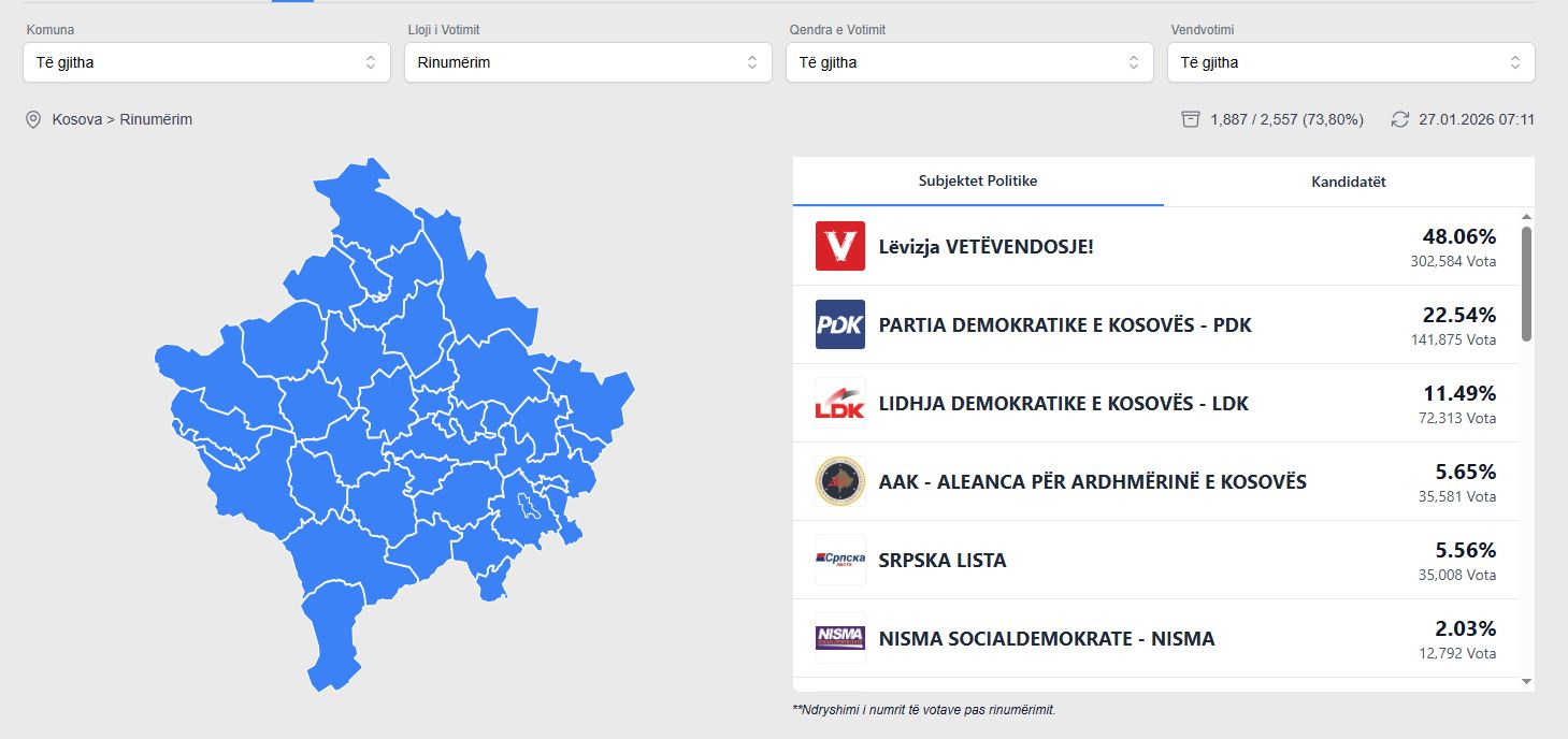 Bazuar në përditësimin e fundit të KQZ-së, deri në ora 07:11 të së martës, janë rinumëruar 73.80% e të gjitha votave.