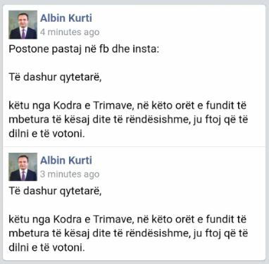këtu nga Kodra e Trimave, në këto orët e fundit të mbetura të kësaj dite të rëndësishme, ju ftoj që të dilni e të votoni.” – ishte postimi i parë, që më pas u ndryshua.