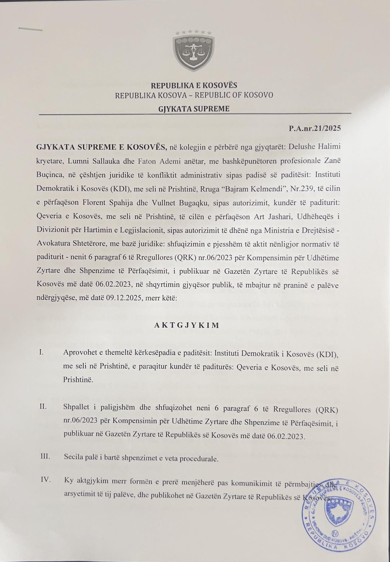Lajmi u bë i ditur nga KDI-ja, ndërsa e paditur në rast ishte Qeveria e Kosovës.