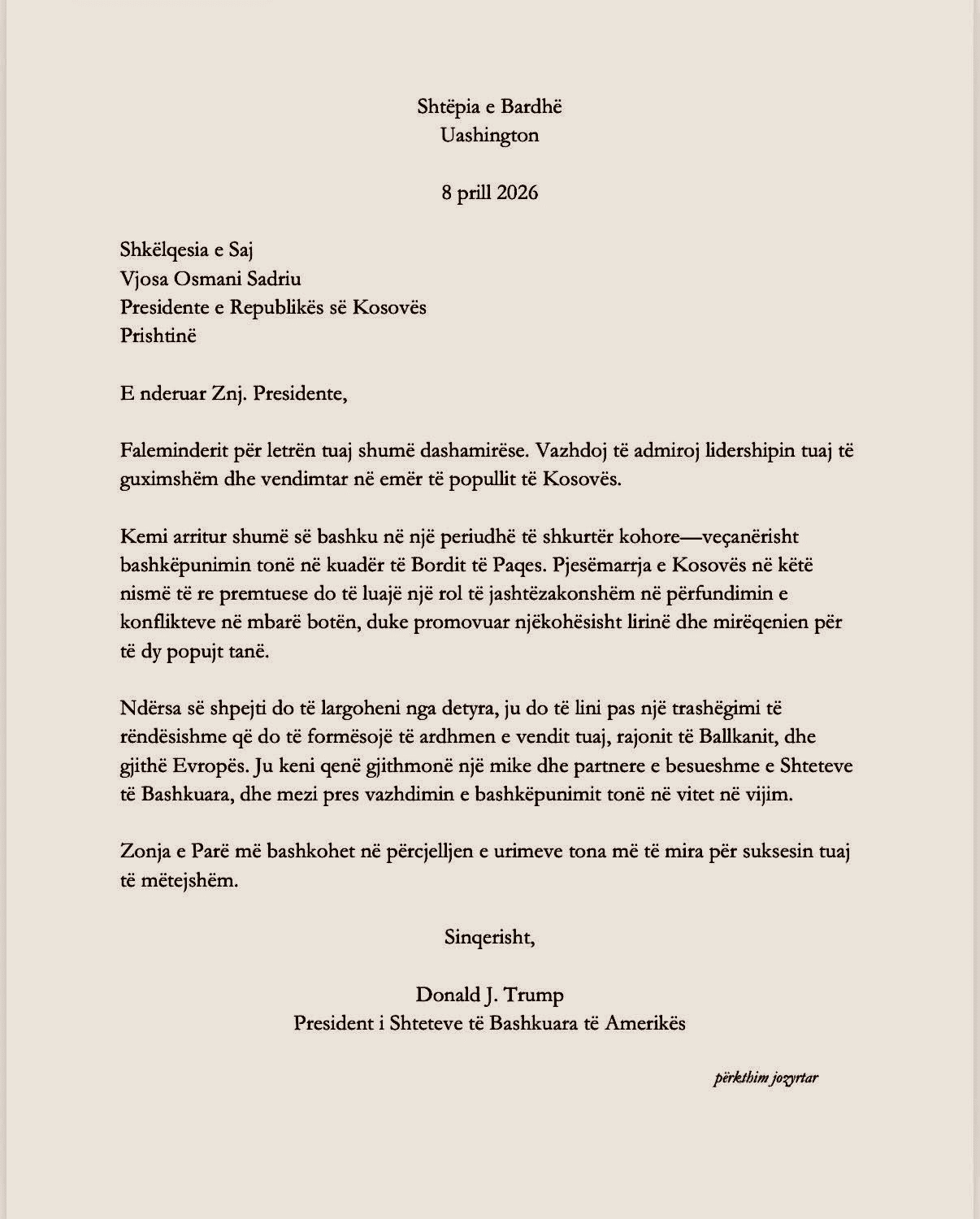Në letër, Trump i tha Osmanit se vazhdon ta admiroj lidershipin e guximshëm dhe vendimtar në emër të popullit të Kosovës.